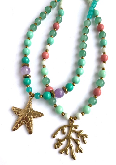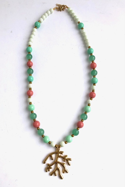 Colar contas de vidro e aço com pendente coral em aço; 41/42 cms e uma correntinha na ponta que permitar aumentar 4 cms