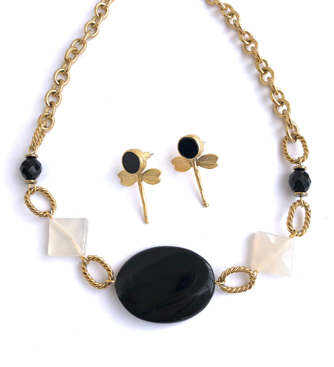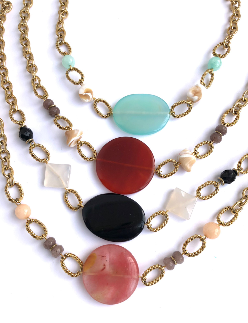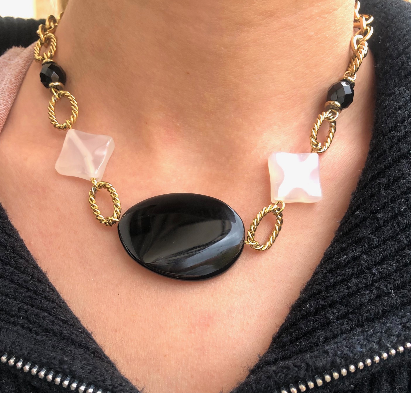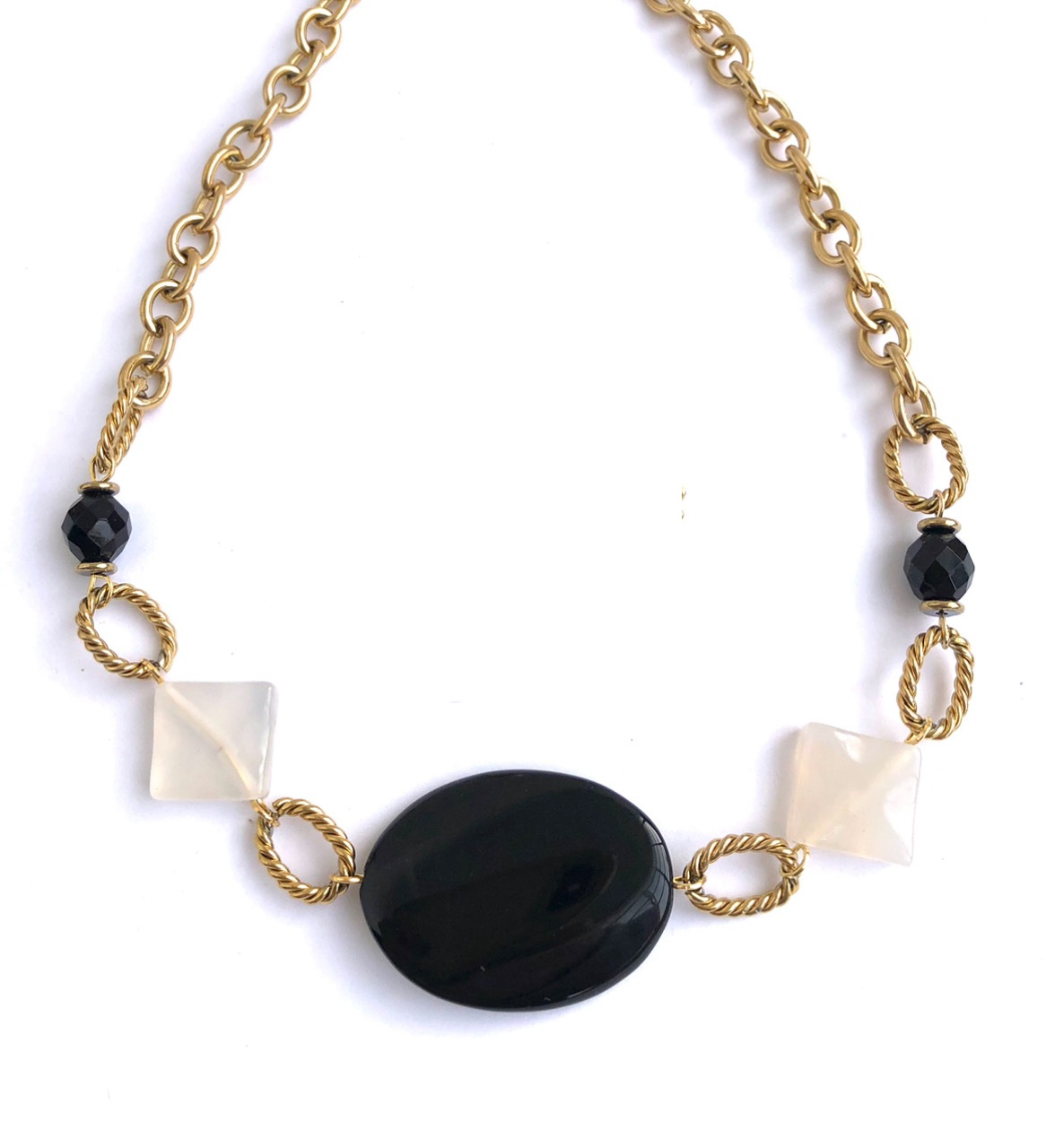 Colar em aço malha larga com ágata central preta e detalhes pedras naturais; tem 45/46 cms e uma correntinha na ponta que permite aumentar 4 cms