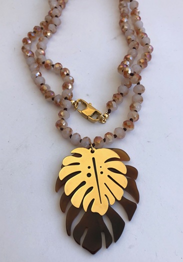 Colar comprido / 2 voltas em cristais brancos com reflexos cobre e folha castanha acrílico e folha em aço