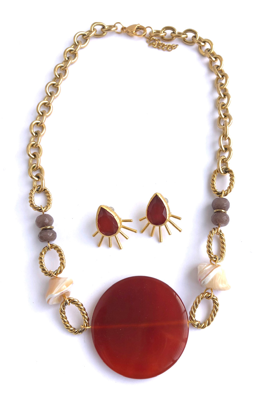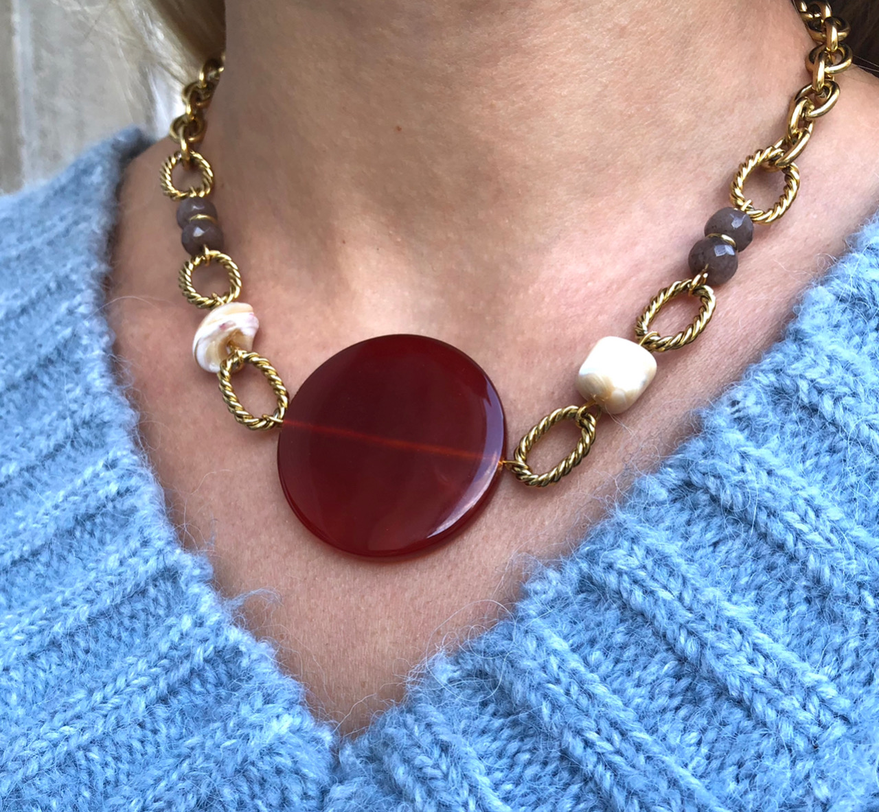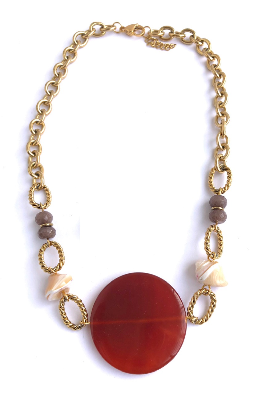 Colar em aço malha larga com ágata central grande e detalhes em madrepérola e ágatas facetadas; 45/46 cms e uma correntinha na ponta que permite aumentar 4 cms