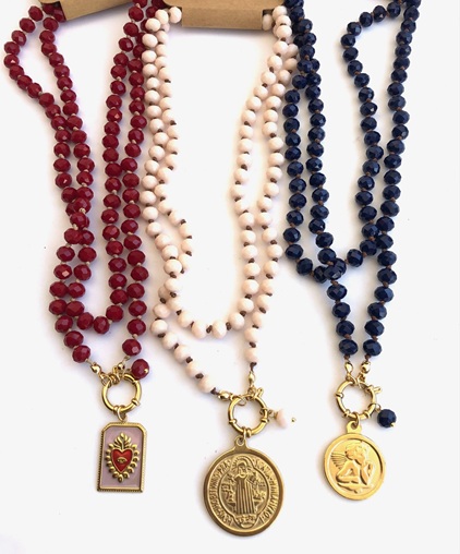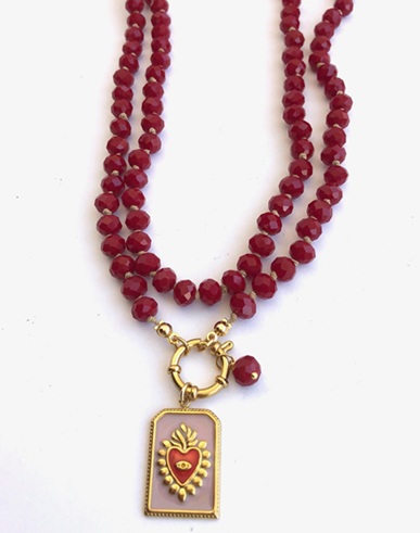 Colar comprido, 2 voltas em cristais vermelho escuro com pendente em aço "Sagrado Coração"
