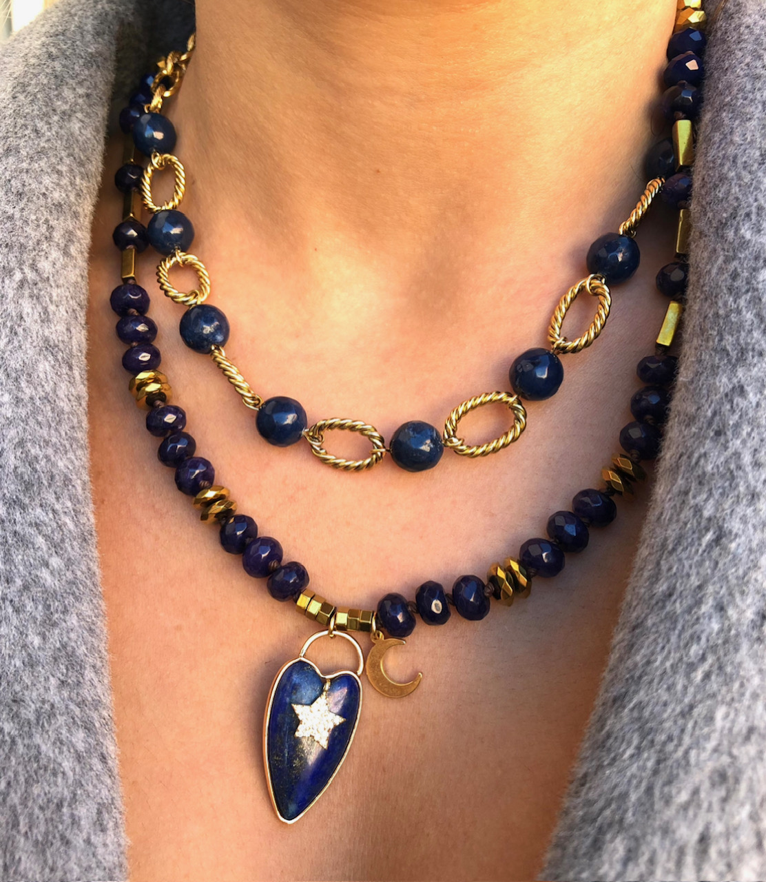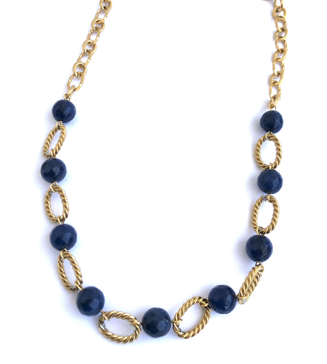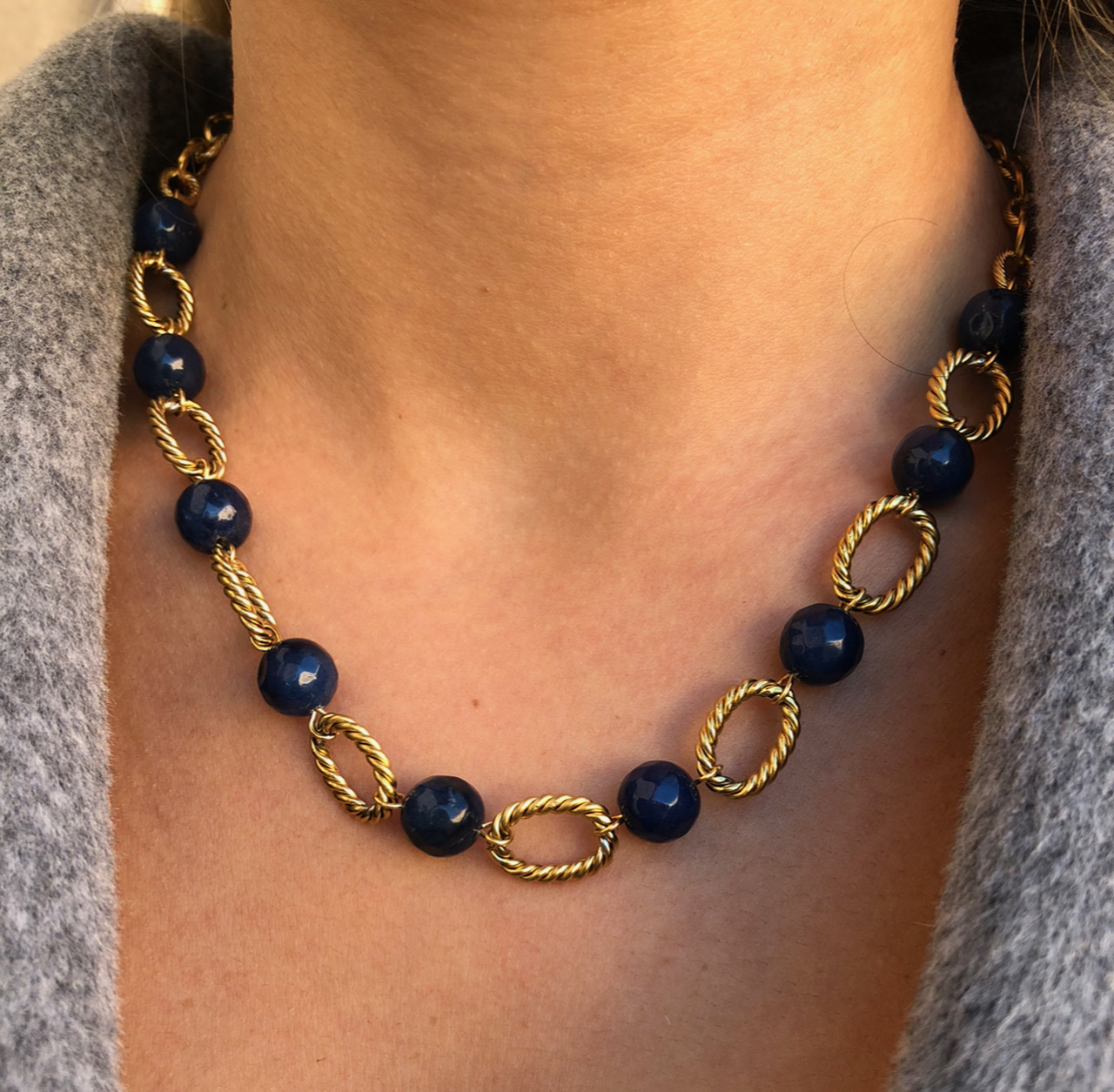 Colar em malha de aço larga com ágatas 10mm intercaladas, cor azul marinho. Disponível em várias cores. Tem 42/43 cms e uma correntinha na ponta que permite aumentar 4 cms