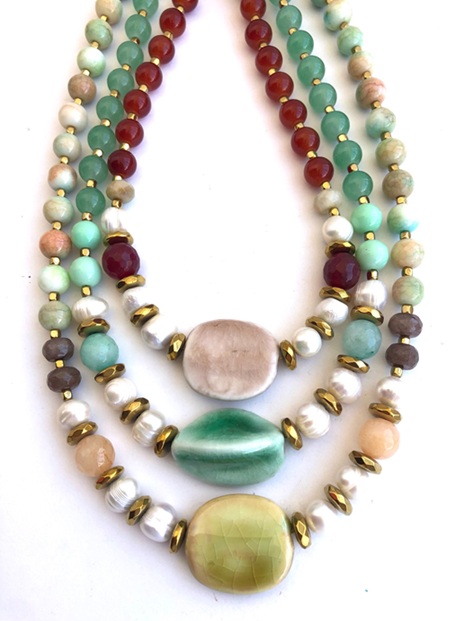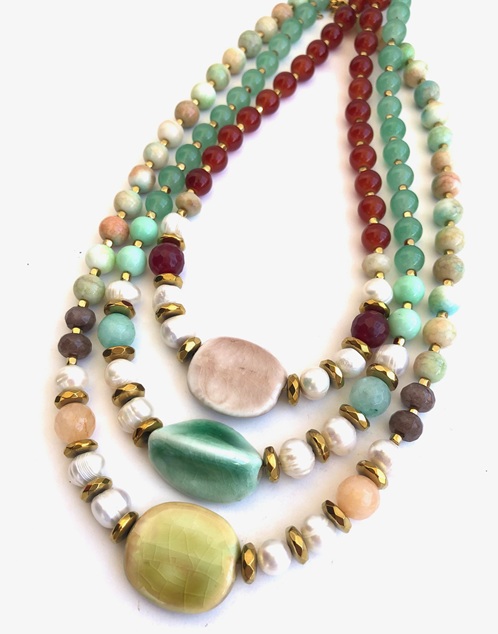 Colares em vidros, pedras naturais, pérolas de água doce e cerâmica; disponíveis nas 3 cores da foto. Medem 45 cms cada mais extensor; se encomendar este artigo deverá especificar por email que cor escolheu.
