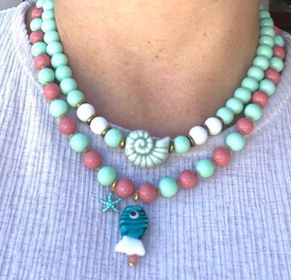 Conjunto de 2 colares de contas de vidro com detalhes em cerâmica, caracol e peixe; pode usar juntos ou em separado. Acabamentos em aço.